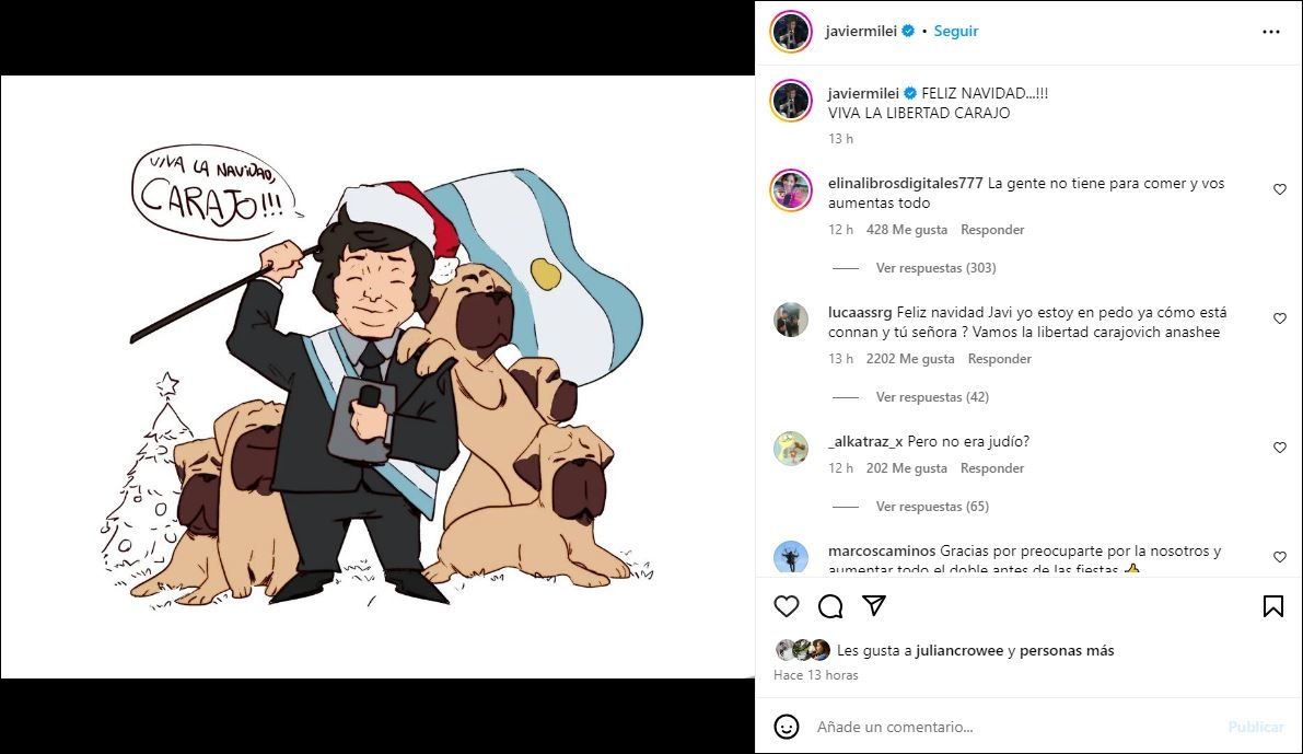 Además de la publicación en X, Javier Milei realizó dos posteos en su cuenta oficial de Instagram. En el primero se lo ve a él, acompañado de sus cinco perros, vestido de traje, con la banda presidencial puesta y con una bandera argentina en su mano derecha. El texto del posteo es el mismo que eligió ayer cuando posteó una foto de pequeño con su hermana, Karina: "Feliz Navidad...!!! Vica la libertad carajo". En la caricatura, el globo de diálogo dice: "Viva la Navidad, carajo!!!".