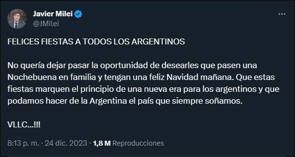 El presidente Javier Milei envió un mensaje de Navidad en el cual expresó que espera que esta fiesta "marque el principio de una nueva era para todos los argentinos" y deseó que "podamos hacer de la Argentina el país que soñamos". El jefe de Estado, en un mensaje navideño publicado en la red social X (antes Twitter) deseó "felices fiestas a todos los argentinos".