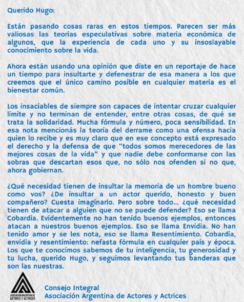 La Asociación Argentina de Actores compartió un comunicado para reivindicar la figura de Hugo Arana, luego de que Javier Milei realice un duro posteo contra el artista este fin de semana.