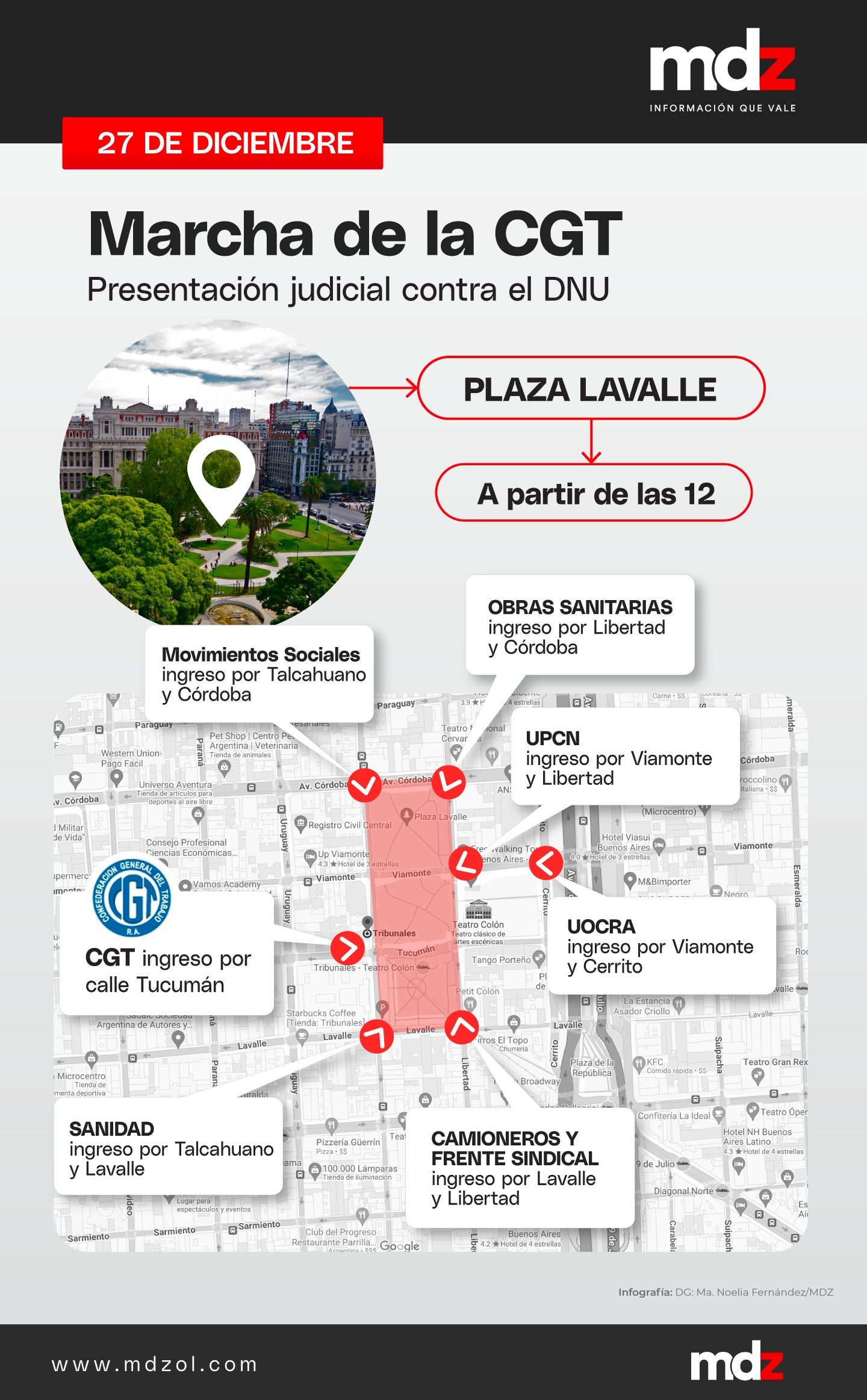 La concentración fue convocada por la CGT frente al Palacio de Justicia, en las calles Lavalle y Talcahuano, en el centro porteño, con el objetivo de acompañar la presentación de una serie de medidas cautelares que frenen los alcances del DNU firmado por el presidente Javier Milei. Sin embargo, la Justicia rechazó la presentación sindical contra el DNU ya que el mismo todavía no tiene vigencia; minutos más tarde comenzó la desconcentración.