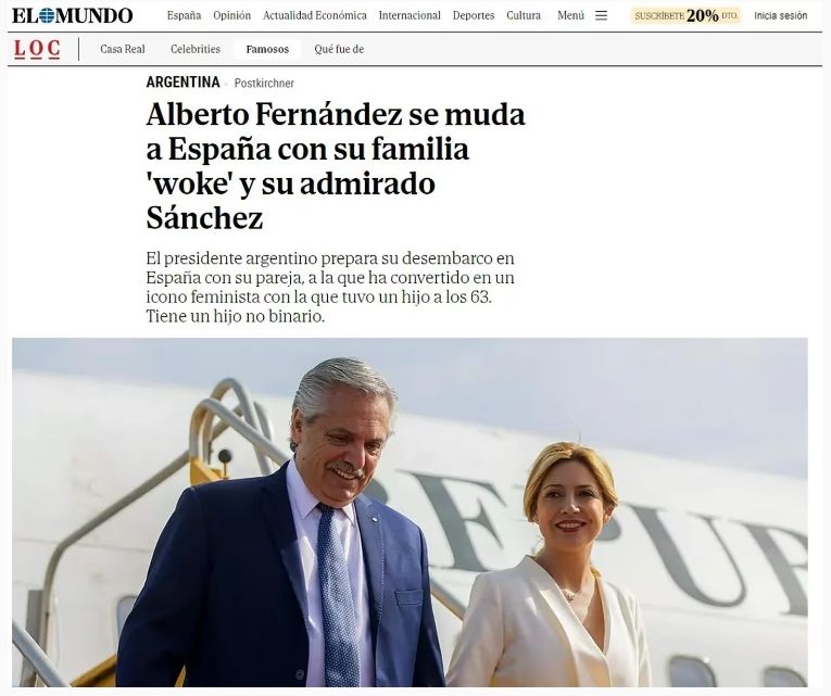 Bajo el título "Alberto Fernández se muda a España con su familia 'woke' y su admirado Sánchez", el artículo señala también que "el presidente argentino prepara su desembarco en España con su pareja (Fabiola Yáñez)", a la que según este medio "ha convertido en un ícono feminista y con la que tuvo un hijo a los 63".