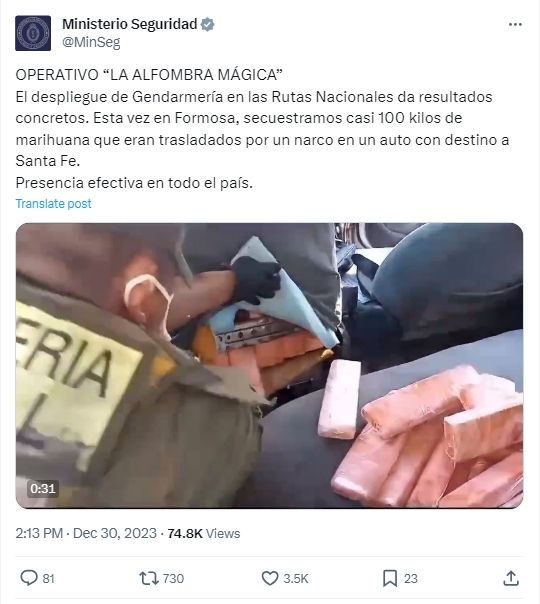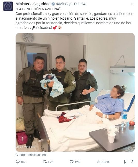 En la cuenta de X del Ministerio de Seguridad no todo es operativos antidrogas y detenciones de delincuentes. También publican el servicio a la comunidad que realizan las fuerzas de seguridad. Así es el caso de los tres gendarmes que en Rosario asistieron a una mujer en el nacimiento de su hijo. Como agradecimiento el niño lleva el nombre de uno de los efectivos.