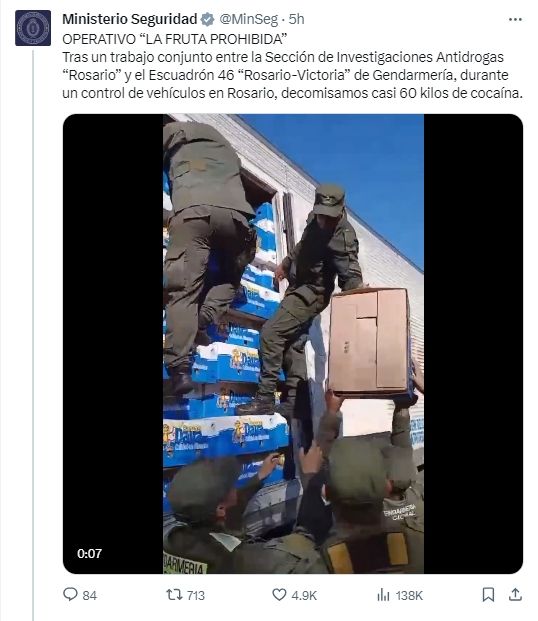 Luego de un trabajo en conjunto entre la Sección de Investigaciones Antidrogas de Rosario y el Escuadrón 46 de Gendarmería Nacional, el Ministerio de Seguridad logró decomisar 60 kilos de cocaína que tenía como destino el Mercado Central de Buenos Aires. El mismo, que viajaba desde Bolivia, fue encontrado entre cajas de bananas. "¡Vamos a fondo contra el narcotráfico!", festejó la cuenta de la cartera dirigida por Patricia Bullrich.