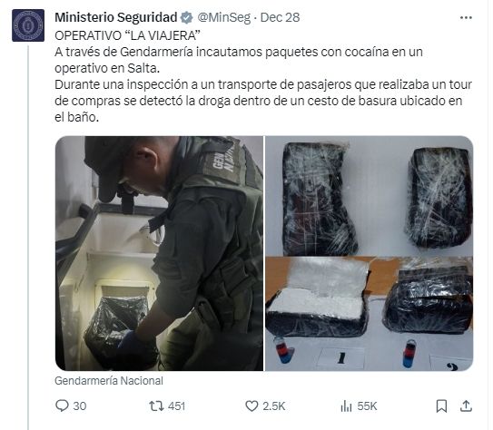 Gendarmería encontró un cargamento de cocaína dentro del baño de un colectivo de pasajeros que realizaba un tour de compras en la provincia de Salta. La mercancía, lejos de ser ropa, fue hallada en el cesto de basura del toilette de la unidad. "Fortalecemos los controles para frustrar los traslados de droga", festejó el CM del Ministerio.