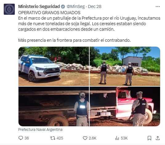 Prefectura Naval Argentina desbarató un intento de contrabando de granos de soja en el Río Uruguay. En total era 9 toneladas de granos que estaban siendo cargados desde un camión a dos embarcaciones.