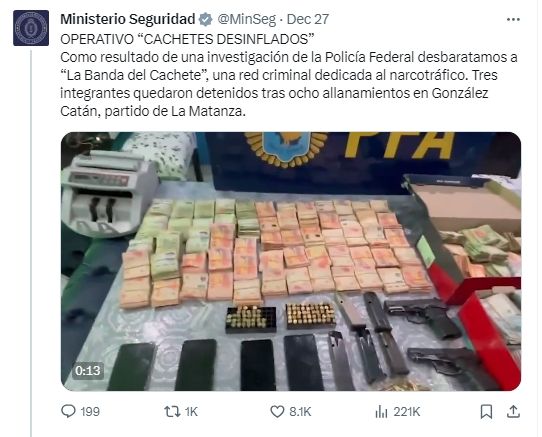 Otra vez en el partido de La Matanza, la Policía Federal desarticuló una banda que se dedicaba al narcotráfico y que era apodada como "La Banda del Cachete". En total se realizaron 8 allanamientos y se detuvieron a tres sujetos. En el raid secuestraron 400 envoltorios de pasta base, paquetes con cocaína, seis armas de fuego y más de 7 millones de pesos. "La lucha sin cuartel contra el narcotráfico no se detiene", fue el mensaje con el que cerró el CM.