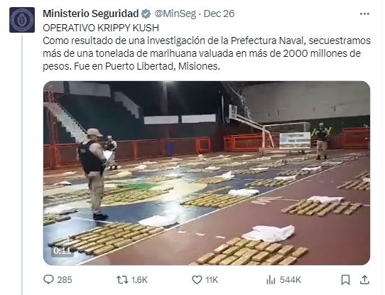El CM del Ministerio de Seguridad de la Nación eligió ponerle Krisppy Kush al operativo donde se incautó, en Misiones, más de una tonelada de marihuana valuada en 2.000 millones de pesos. El cargamento fue encontrado en Puerto Libertad, en la frontera con Paraguay, y el nombre, claramente, responde a la canción de Farruco.