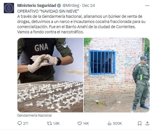 Una de las denominaciones que tiene la cocaína es la de "nieve", por eso tras "reventar" un búnker de venta en el barrio Anahí de la ciudad de Corrientes, donde se encontraron varios paquetes de cocaína fraccionada y se detuvo a un individuo que la comercializaba, la cuenta de X del Ministerio publicó, en la previa de Noche Buena, el logro de la Gendarmería Nacional.
