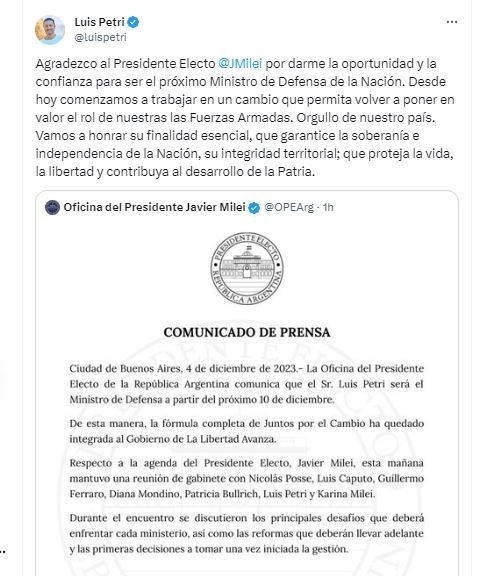 Finalmente, los votos de Juntos por el Cambio se trasladaron casi en su totalidad a la candidatura de Milei, que se impuso en el balotaje por 11 puntos de diferencia con su rival Sergio Massa. Este lunes, a dos semanas de las elecciones, se confirmó que Luis Petri tendrá un lugar en el gabinete nacional. En enero, cuando se lanzaba como precandidato a gobernador, Petri jamás imaginó que terminaría el año siendo designado como Ministerio de Defensa en un gobierno liberal.