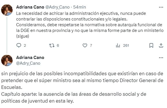 "La necesidad de achicar la administración ejecutiva, nunca puede contrariar las disposiciones constitucionales y/o legales. Consideramos, debe respetarse la normativa sobre autarquía funcional de la DGE en nuestra provincia y no que la misma forme parte de un Ministerio sin prejuicio de las posibles incompatibilidades que existirían en caso de pretender que el súper ministro sea al mismo tiempo Director General de Escuelas. Capítulo aparte: la ausencia de las áreas de desarrollo social y de políticas de juventud en esta ley", manifestó Cano.