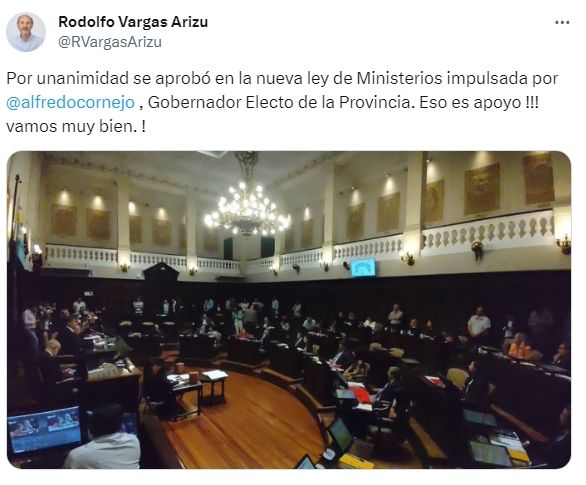 10.08 - Senadores del PJ darán los votos para para aprobar la Ley de Ministerios de Cornejo. El senador sanrafaelino Pedro Serra adelantó que votará afirmativamente. También lo hará su coterráneo Mauricio Sat. "Puede gustarme o no la Ley de Ministerios que @alfredocornejo envió a la Legislatura. Creo también que su tratamiento exprés no es lo adecuad Pero estoy convencido que el Gobernador electo tiene todo su derecho a organizar su gobierno como mejor le parezca Mi voto va a ser positivo", publicó Serra.