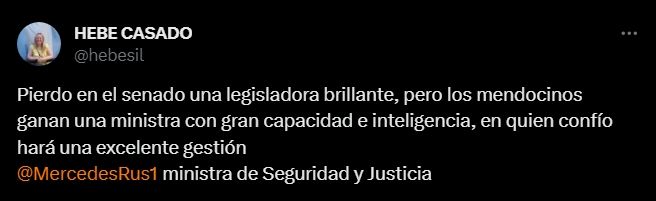17.30 - Hebe Casado felicitó por anticipado a la nueva ministra de Seguridad de Mendoza. "Pierdo en el senado una legisladora brillante, pero los mendocinos ganan una ministra con gran capacidad e inteligencia, en quien confío hará una excelente gestión @MercedesRus1 ministra de Seguridad y Justicia", dijo la vicegobernadora electa a dos horas del anuncio oficial en la Nave Cultural.
