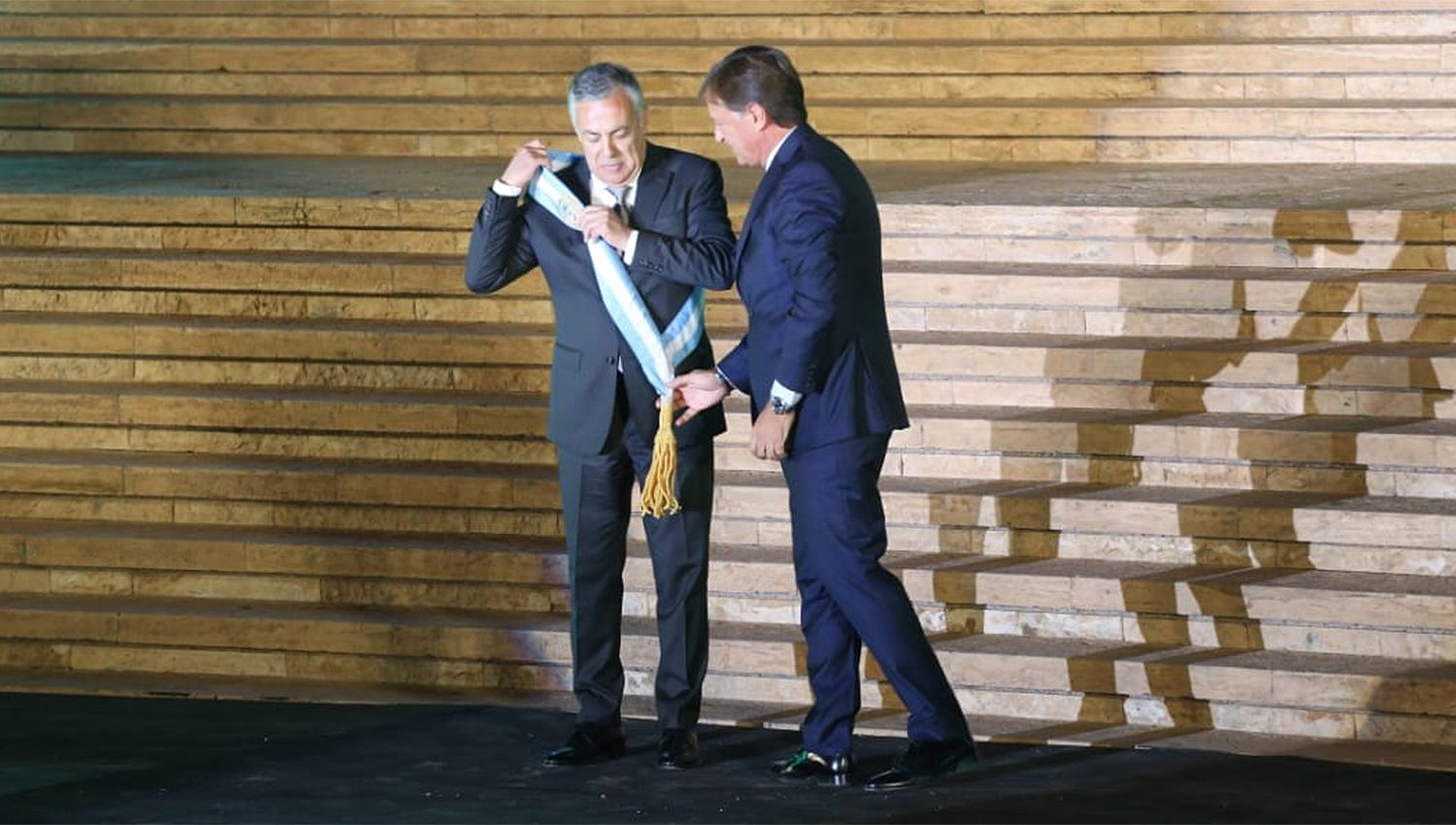 21.02 - Rodolfo Suarez le entregó bastón y banda a Alfredo Cornejo, los atributos como nuevo gobernador de Mendoza.