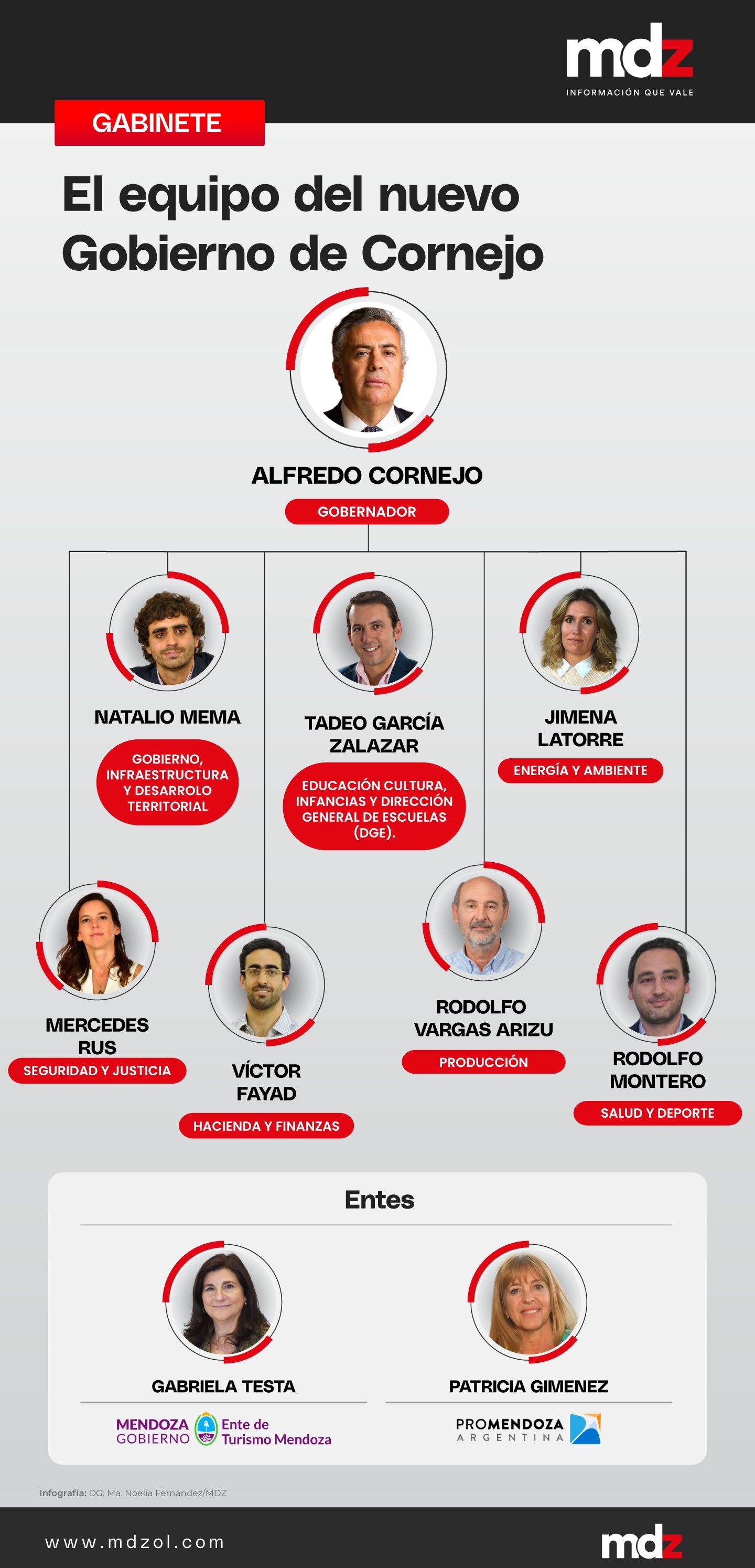 Primero, la "generacional" de Cornejo tendrá en sus manos la gestión. Se trata de un grupo de dirigentes de mediana edad que tendrán por primera vez estarán en la primera línea, aunque con la supervisión de Cornejo; el jefe. Jimena Latorre, Natalio Mema, Mercedes Rus pertenecen al mismo grupo político y generacional. También es parte de ese grupo Víctor Fayad, el único que logró la "reelección" y continúa en el cargo. Mema y Latorre con parte de la cantera cornejista y fueron ascendidos. El hasta ahora secretario de Servicios Públicos le puso el cuerpo al intento de enfrentar al demarchismo en Luján. Y con Latorre formaron un grupo político que se animó a dar peleas internas dentro del propio sector liderado por Cornejo. La exdiputada es una de las dirigentes más destacadas por el propio gobernador electo desde el punto de vista técnico. Ahora tendrá a cargo un ministerio nuevo y que tiene el desafío económico más importante: impulsar las industrias relacionadas con los recursos naturales.