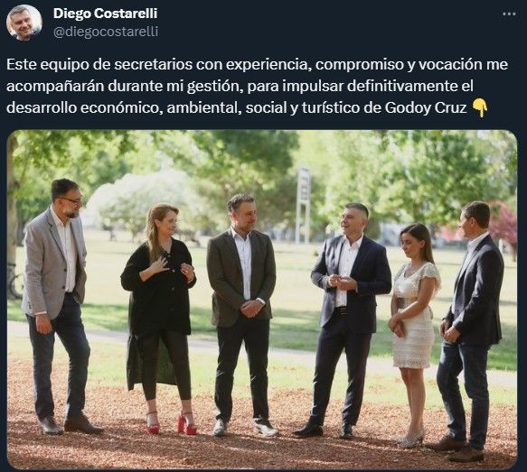 El futuro intendente de Godoy Cruz, Diego Costarelli, dio a conocer este viernes a las principales figuras de su Gabinete. El sucesor de Tadeo García Zalazar ratificó a algunos funcionarios actuales de la comuna, pero también anunció el desembarco de dirigentes que ocuparon recientemente cargos a nivel provincial.