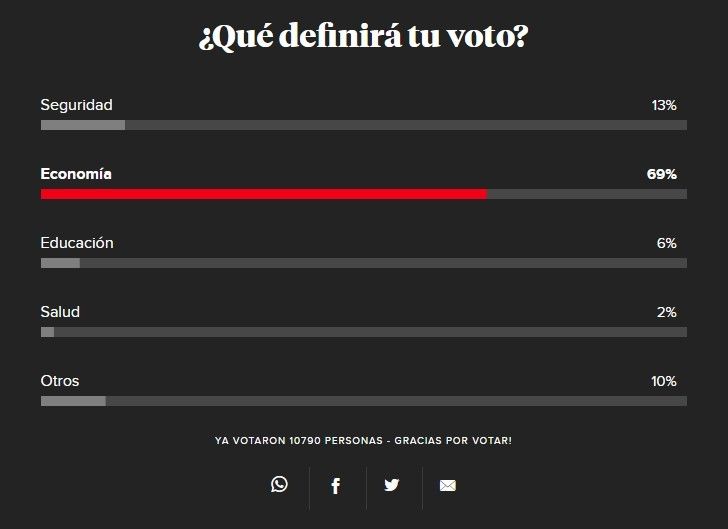 Con más de 10 mil lectores participando de consulta, el 69% (7.808 votos) señaló que es la economía lo más relevante. Muy por debajo se encuentra la preocupación en torno a la seguridad, opción que obtuvo el 12% (1.392 votos).