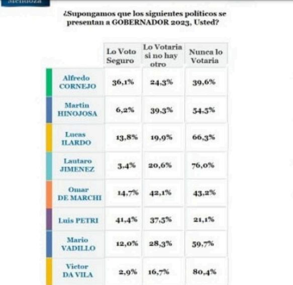 Por último, el peronismo queda muy mal parado ya que el 54,5% de los encuestados dijo que nunca votaría a Martín Hinojosa y el 66,3% nunca votaría por Lucas Ilardo.