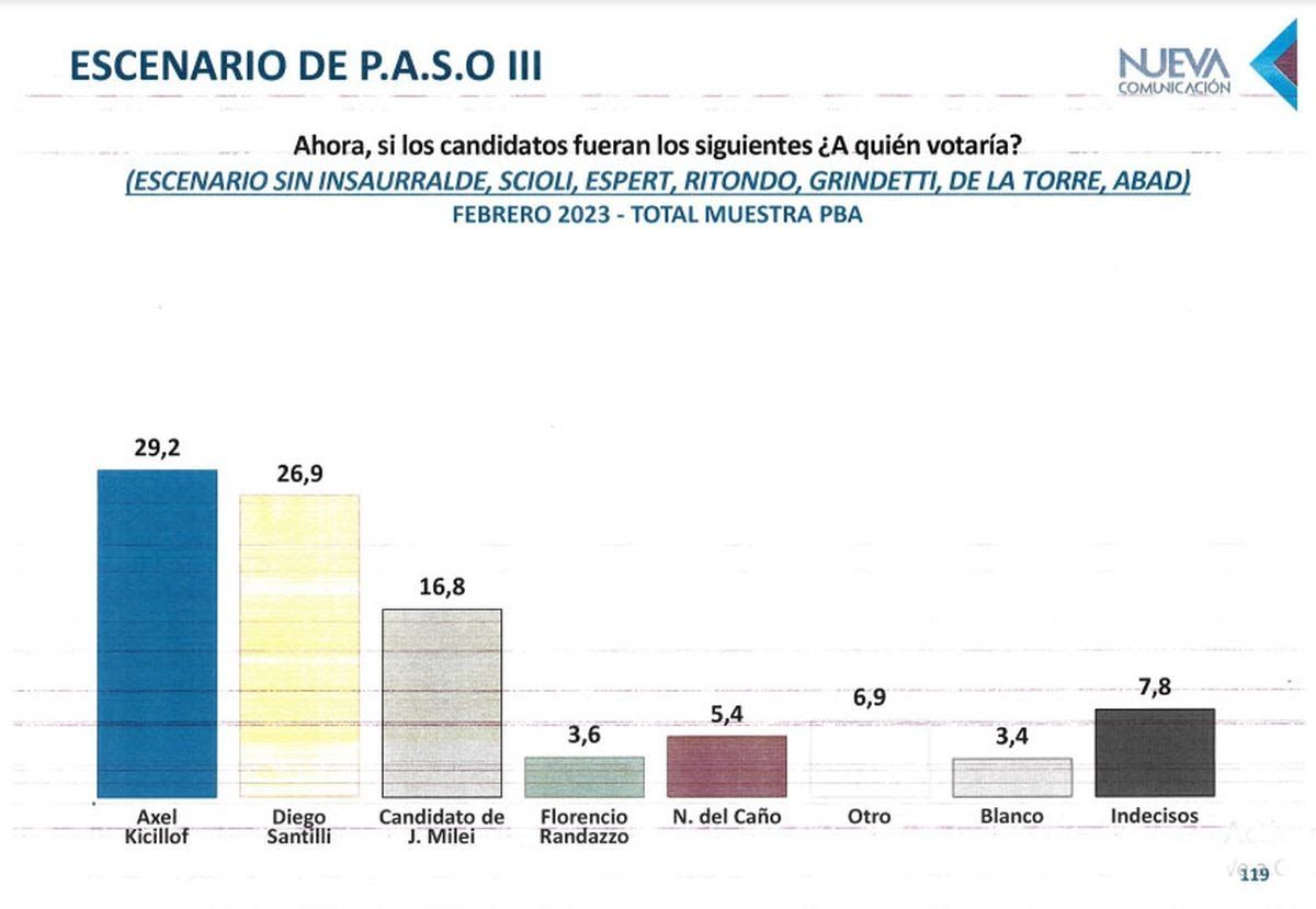 De acuerdo a la encuesta se registra un escenario de empate técnico entre el kirchnerismo y el macrismo cuando el enfrentamiento se plantea directamente entre Axel Kicillof y Diego Santilli. El actual gobernador registra un 29,2% de intención de voto mientras que Santilli llega al 26,9%. Teniendo el margen de error de la encuesta, la elección se presenta con un final abierto más teniendo en cuenta que la fuerza de Javier Milei alcanza al 17% de intención de voto en territorio bonaerense.