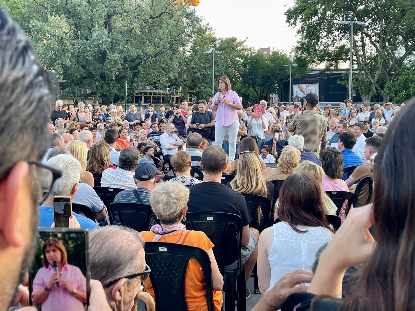Por la tarde, la exministra de Seguridad reunió a más de 600 personas en un encuentro con vecinos que se desarrolló en un parque de barrio Pichincha y tuvo como ejes la inseguridad y el narcotráfico.