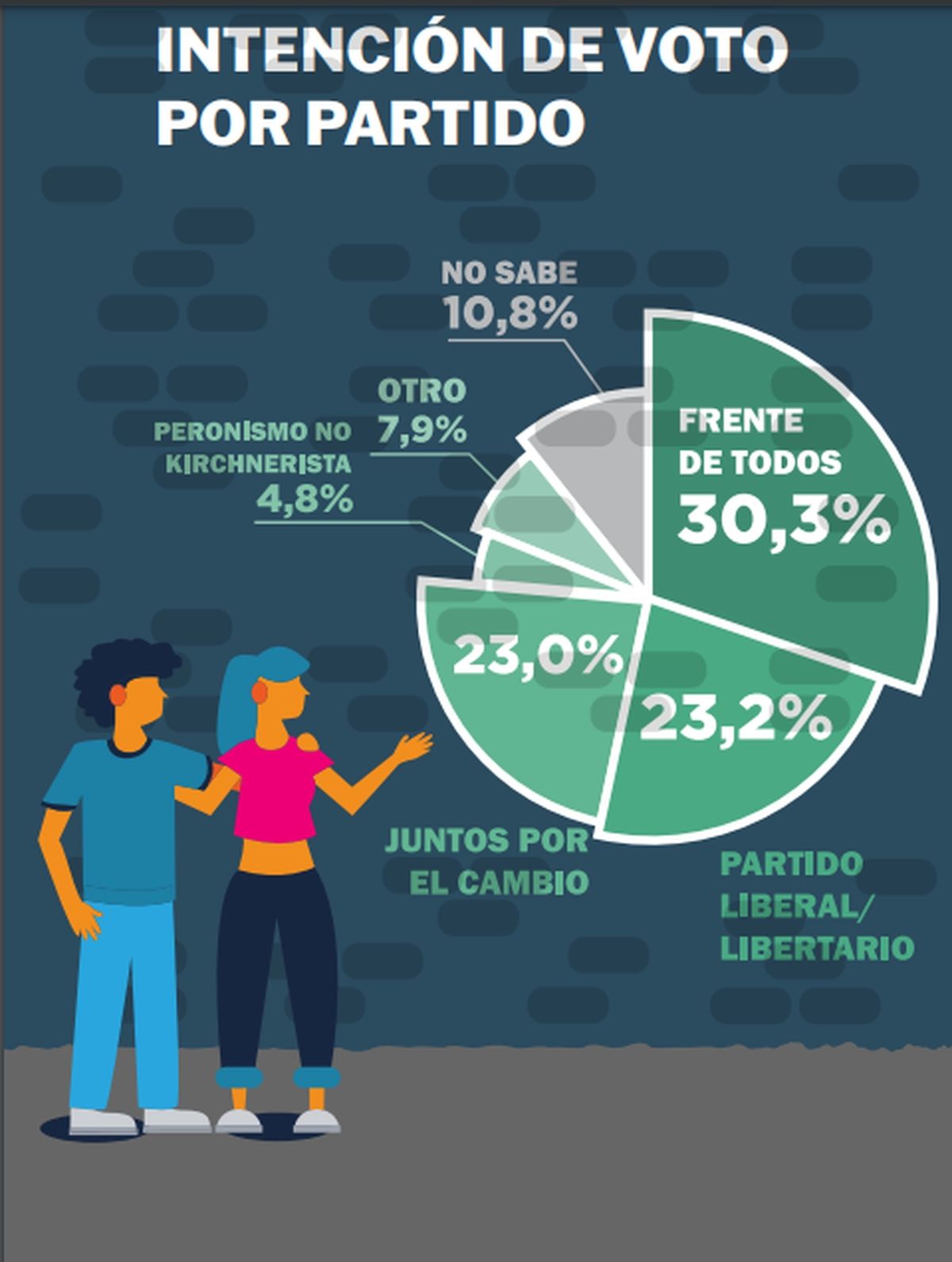 De acuerdo a la encuesta, entre el electorado joven la intención de voto por partido muestra al kirchnerismo del Frente de Todos con 30,3%; a Juntos por el Cambio con 23,0%; a La Libertad Avanza de Javier Milei con 23,2% y el peronismo no kirchnerista con 4,8%.