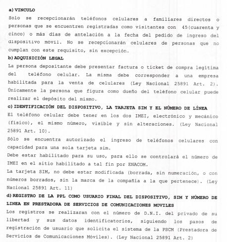 - Las comunicaciones mediante teléfono celular sólo podrán realizarse en los recintos de alojamiento. En consecuencia, queda prohibida la utilización de dispositivos móviles en dispositivos móviles en los patios, pasillos, accesos, espacios educativos, laborales y cualquier ámbito que no sea exclusivamente de alojamiento.