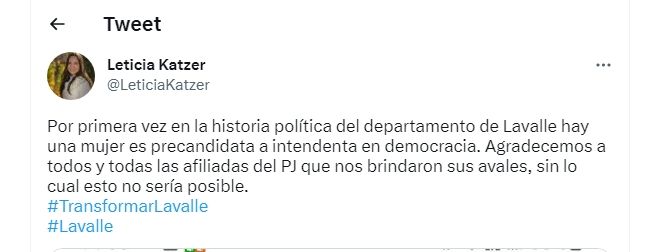 En cuanto a Katzer, la investigadora del Conicet subrayó a través de sus redes sociales: "Por primera vez en la historia política del departamento de Lavalle hay una mujer es precandidata a intendenta en democracia. Agradecemos a todos y todas las afiliadas del PJ que nos brindaron sus avales, sin lo cual esto no sería posible".