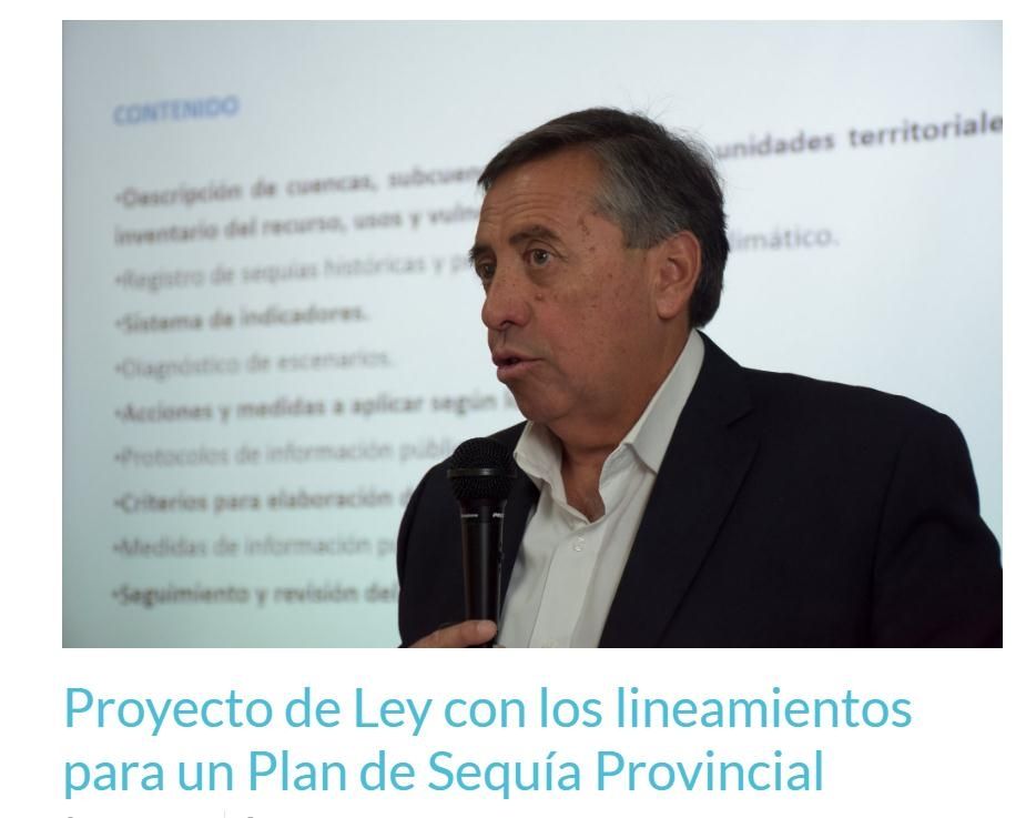 El ex gobernador Alfredo Cornejo había mandado a la Legislatura de Mendoza, el proyecto de ley con los lineamientos para elaborar un Plan Provincial de Sequía en el año 2018, que defendió el actual Superintendente de Irrigación Sergio Marinelli, que fracasó por una delegación abusiva de atribuciones a Irrigación que compromete la propiedad, el uso del suelo y el derecho de inherencia del agua su que seguramente de ganar las elecciones su mentor Cornejo volverá a ser parte de la agenda legislativa.
