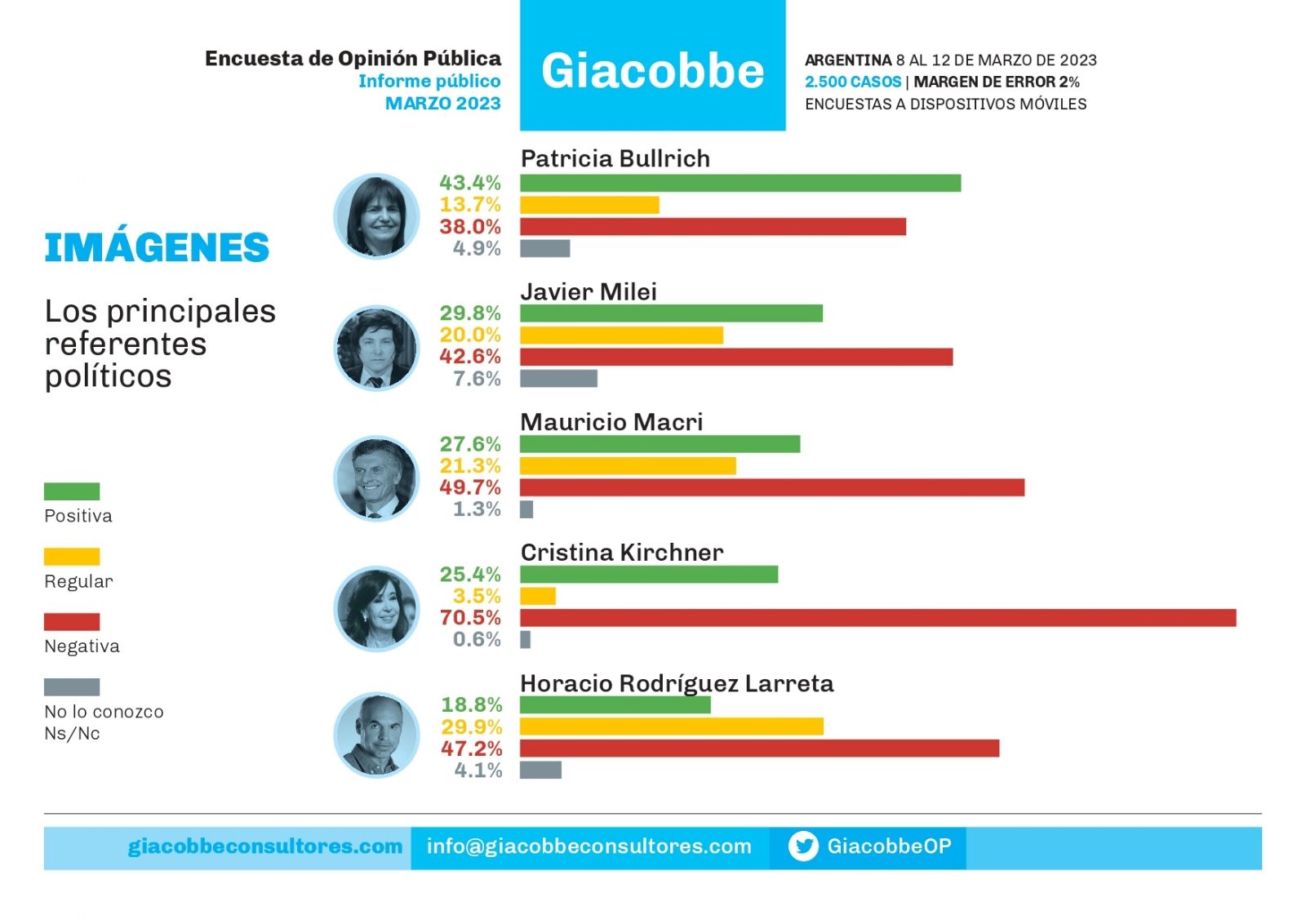 - La presidenta del PRO, Patricia Bullrich, encabeza la lista de imagen positiva con un 43,4% y le sigue el diputado de La Libertad Avanza, Javier Milei, con un 29,8%.