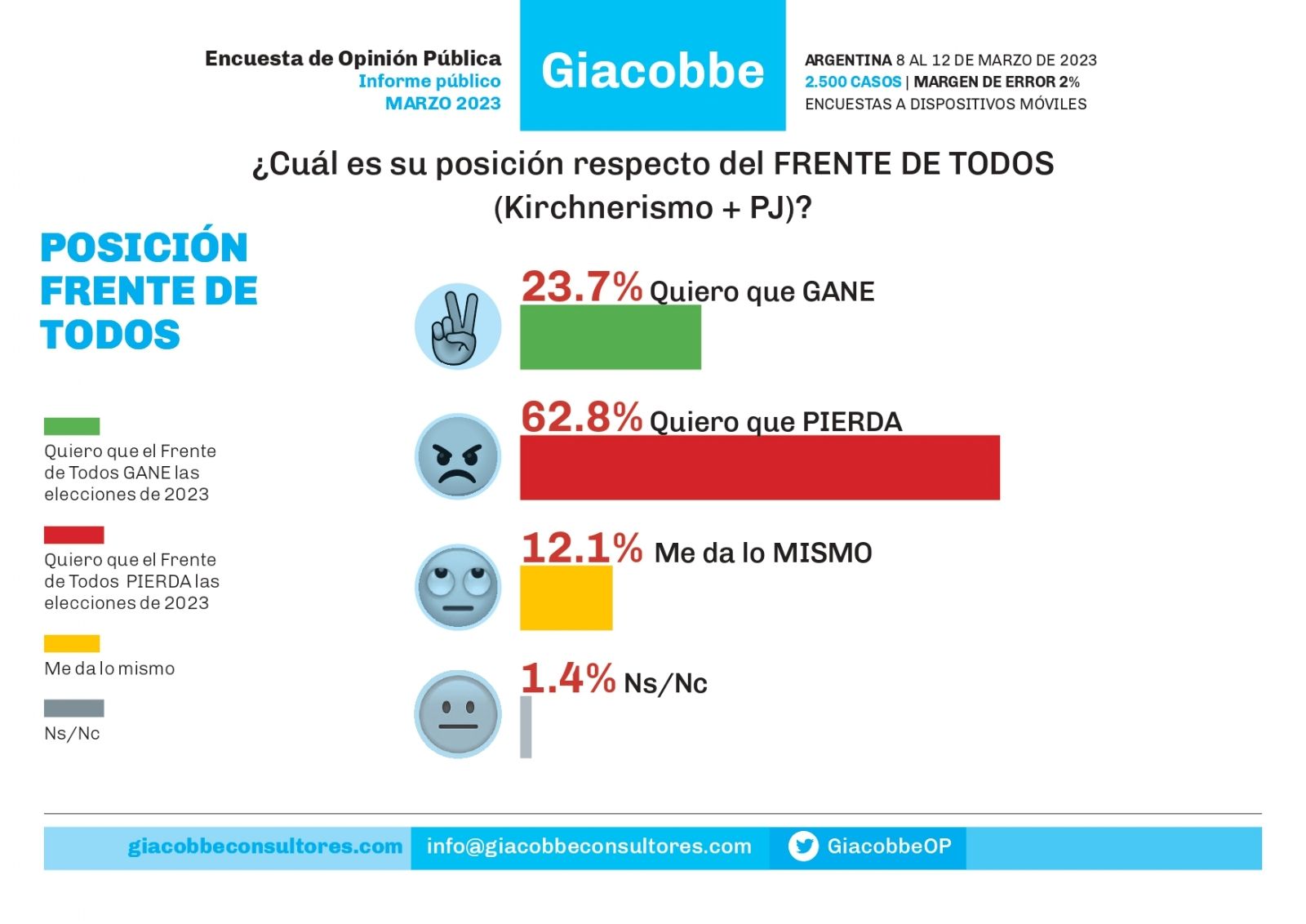 Más allá de la poca confianza económica en el oficialismo, la intención de que siga en el poder continúa bajando. Giacobbe lo midió con la siguiente pregunta: "¿Cuál es su posición respecto del Frente de Todos (Kirchnerismo + PJ)?".