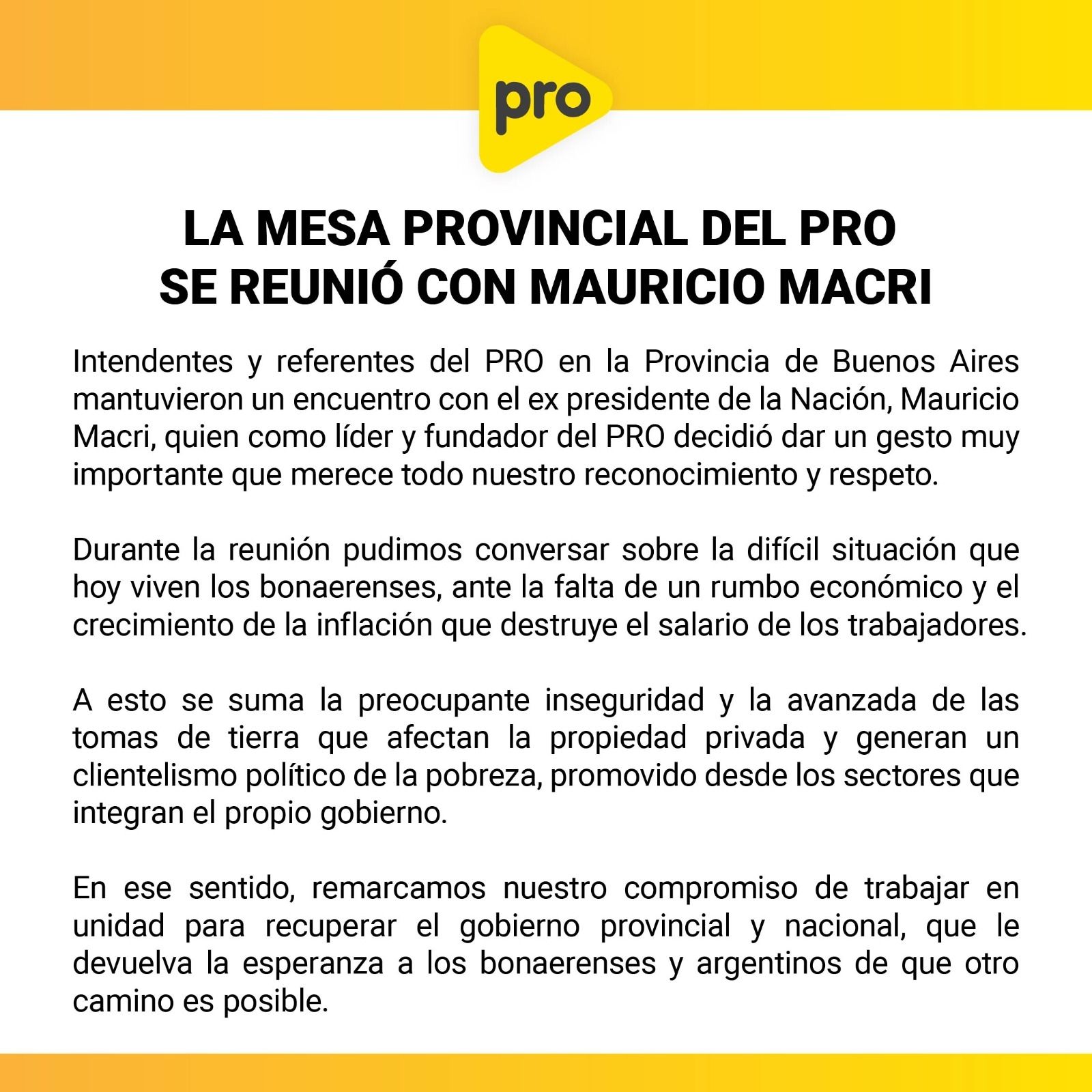 El documento oficial difundido por la Mesa provincial del PRO destaca la actitud que tuvo el expresidente de bajarse de la puja interna pero a la vez reconoce su liderazgo interno: “Fue absolutamente claro y tajante sobre su concepto de no ser presidente pero no será prescindente y dirá quién es el candidato que más le guste cuando lo tenga que hacer".
