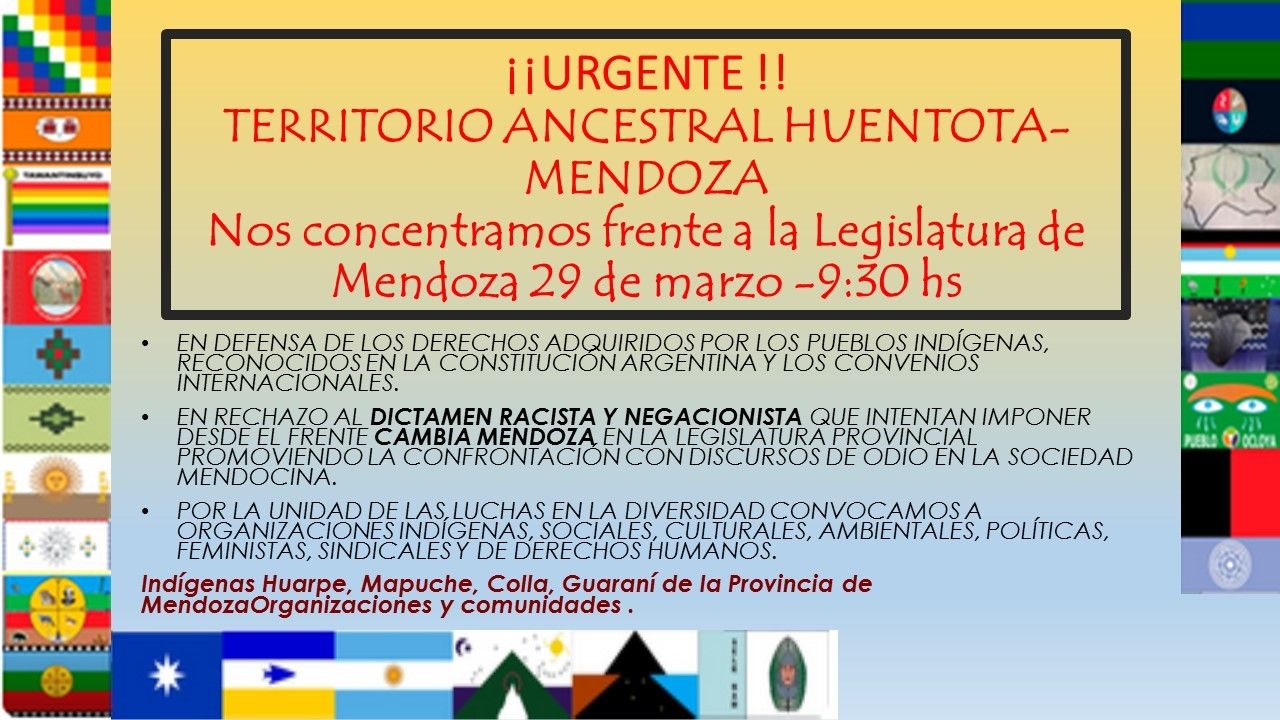 E indicaron: "Convocamos a adherir a este comunicado a organizaciones indígenas, sociales, culturales, ambientales, políticas, sindicales, feministas y de derechos humanos; y a concentrarnos presencialmente en las puertas de la Legislatura de Mendoza el día miércoles 29 de marzo a las 9.30 hs con el fin de solicitar el no tratamiento de este dictamen, su pase a archivo y que se retome el respeto a los derechos adquiridos de los pueblos indígenas, tanto en la Constitución Nacional como en los tratados internacionales".