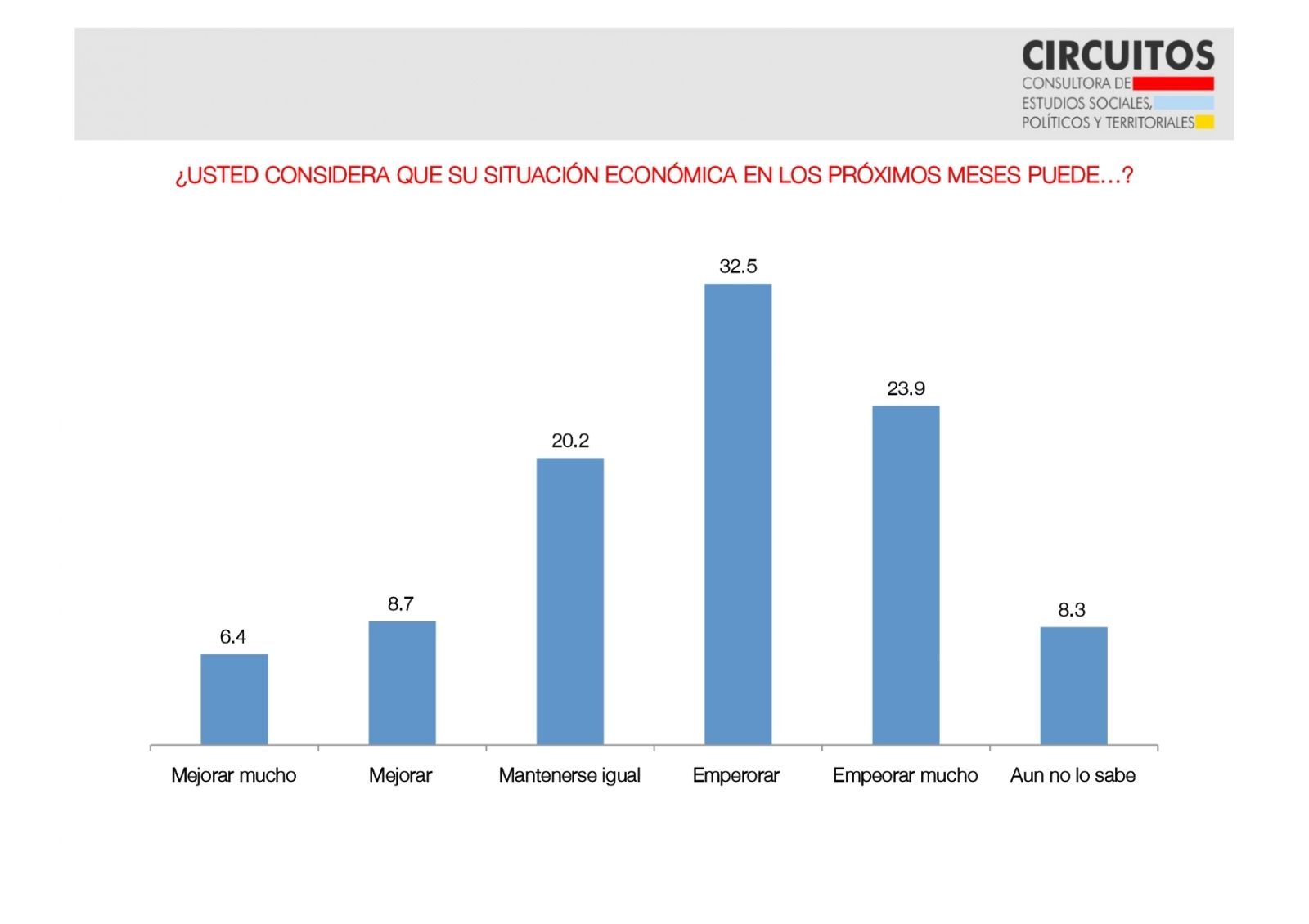Con la información previa de panorama, Circuitos indica lo siguiente. El 43,1% de los encuestados cree que la situación actual del país es muy mala. El 23,7% considera que es mala y el 15,9% que es regular. Sólo el 9,3% la comprende como buena y el 5,1% como muy buena. 66,8% de negatividad y 14,4% de positividad.