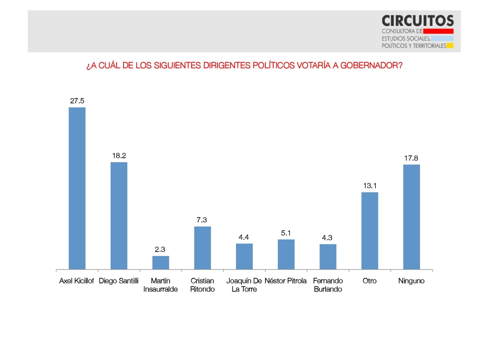 En la actualidad, el gobernador bonaerense, Axel Kicillof, se impone ante los otros candidatos con un 27,5% de intención de voto. El 18,2% eligió al diputado del PRO, Diego Santilli, y luego aparece el exministro de Seguridad, Cristian Ritondo. El descontento con los políticos presentados es tal que el 13,1% destacó que votaría a "otro" y el 17,8% afirmó que no votaría a ninguno.