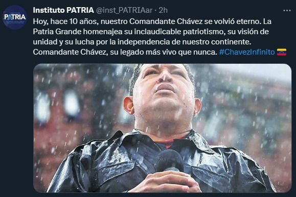 "Hoy, hace 10 años, nuestro Comandante Chávez se volvió eterno. La Patria Grande homenajea su inclaudicable patriotismo, su visión de unidad y su lucha por la independencia de nuestro continente. Comandante Chávez, su legado más vivo que nunca. #ChavezInfinito", escribieron en la cuenta oficial del Instituto Patria, una asociación civil que concentra el pensamiento del kirchnerismo duro.