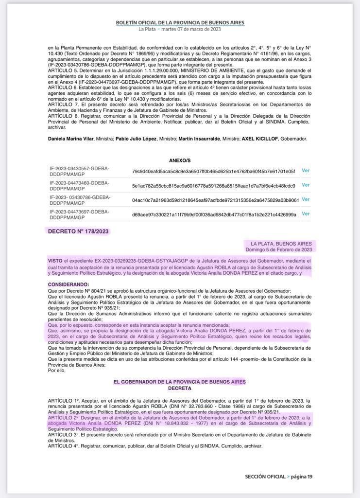 La oficialización del cargo de la exfuncionaria nacional se conoció hoy, luego de que se publique en el Boletín Oficial el Decreto N.º 178/2023, con fecha del domingo 5 de febrero, mediante el cual se acepta la renuncia presentada por el licenciado Agustín Robla designando en su reemplazo, desde el primero de febrero, a la abogada Victoria Analía Donda Pérez en el cargo de Subsecretaria de Análisis y Seguimiento Político Estratégico, quien reúne los recaudos legales, condiciones y aptitudes necesarios para desempeñar dicha función. Según consta en el decreto firmado por el gobernador Axel Kicillof y el jefe de Gabinete de ministros Martin Insaurralde.