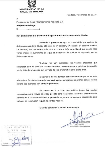 Desde la capital mendocina expresaron a través de un escrito que el municipio ha recibido una numerosa cantidad de reclamos de vecinos que, por distintas vías, han hecho notar deficiencias en el suministro de agua. Esta situación se ha agravado en las últimas semanas y ante ello el intendente Ulpiano Suarez expresó su malestar con una carta dirigida a Aysam exigiendo las mejoras en el servicio.