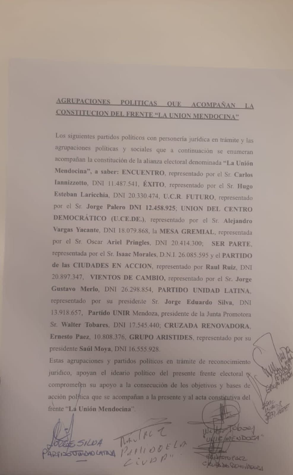 Las firmas hasta ahora son de Encuentro del Empresario del Agro, de Carlos Iannizzotto, que ya hace un año se tomó una foto con De Marchi anticipando lo que se podía venir: si él dejaba la alianza con el radicalismo, tendría el aval de ese espacio. También firmó “Éxito” liderado por Hugo Larricchia que en los comicios anteriores se hizo conocido por su idea de “Mendoexit”; UCR Futuro de Jorge Palero y UCEDE representado por Alejandro Vargas Yacante.