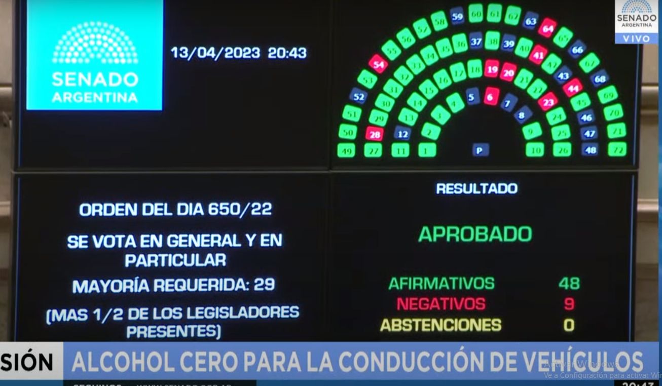 Este miércoles, la Cámara de Senadores de la Nación debatió el proyecto de Alcohol cero al volante que busca bajar el límite de gramos de alcohol en sangre de 0.5 a 0,0. Con 48 votos a favor, 9 en contra y 0 abstenciones, el mismo se convirtió en ley en el Senado.