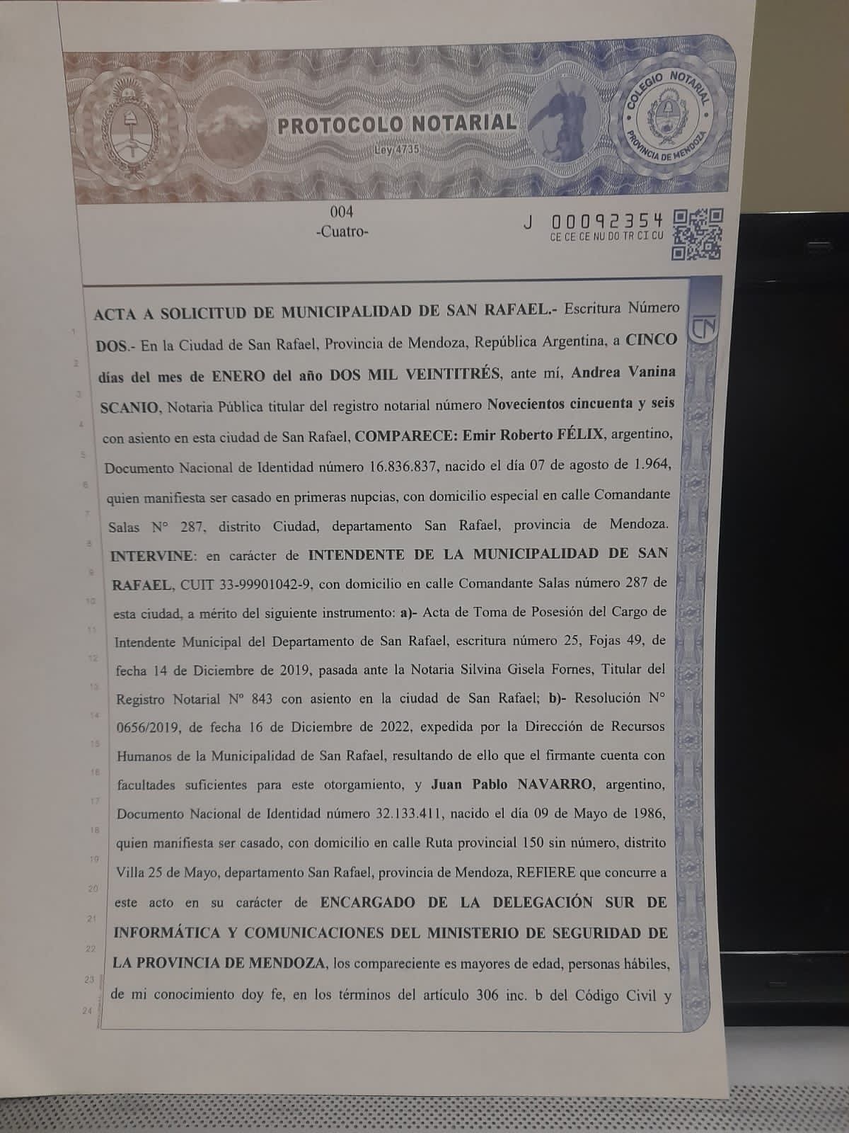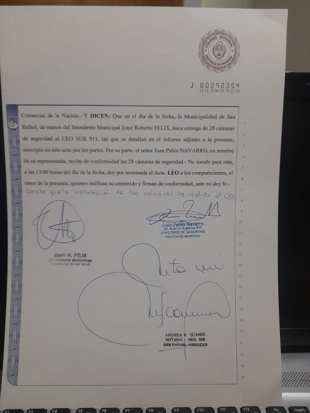 Justamente desde la municipalidad dieron a conocer el convenio que se firmó el día que se donaron las cámaras de seguridad. El acta está firmada por el intendente Emir Félix y por Juan Pablo Navarro, encargado de la delegación sur de informática y comunicaciones del Ministerio de Seguridad de Mendoza. En el papel dejan constancia de la entrega de 28 cámaras de la comuna al CEO Sur 911 y en la última línea figura que la instalación las mismas las realizará el CEO. “Se han instalado solo dos cámaras de las 28 que donó el municipio”, explicaron desde la comuna. En Seguridad le bajan el valor e ese documento porque, explican, es solo un acta de entrega de las cámaras y sigue vigente el convenio firmado por Félix y Suarez.