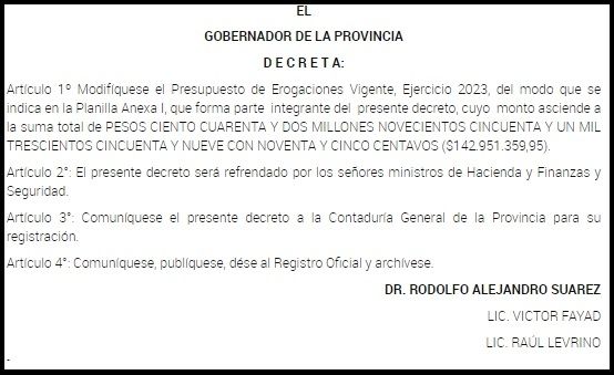 El decreto, que modifica “el Presupuesto de Erogaciones Vigente” fue firmado también por los ministros de Hacienda y Finanzas (Víctor Fayad) y de Seguridad (Raúl Levrino).