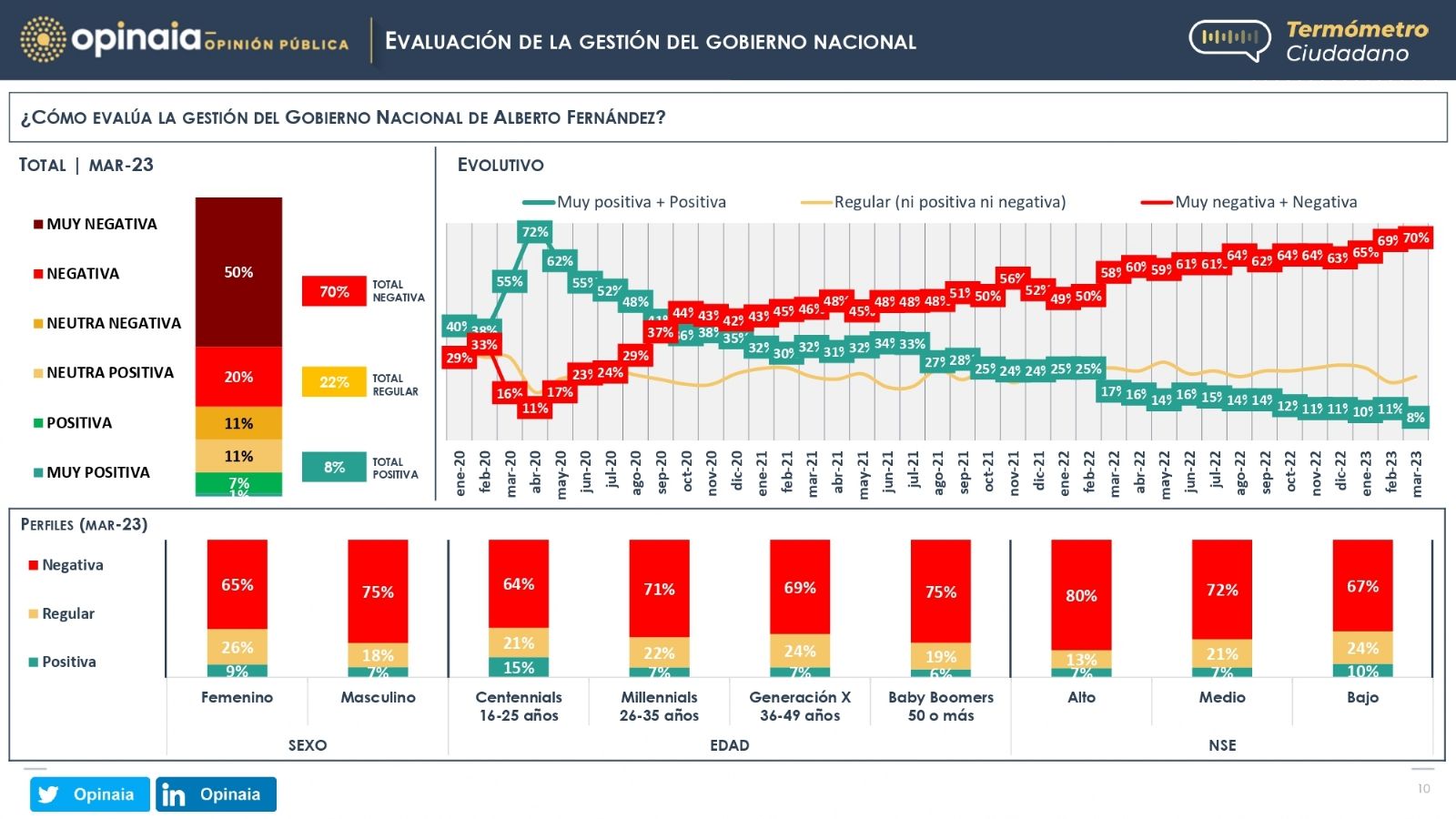 Respecto a la gestión del Gobierno nacional, el 70% lo cataloga como negativo y el 22% como regular. Sólo el 8% destaca cuestiones positivas en la gestión oficialista.