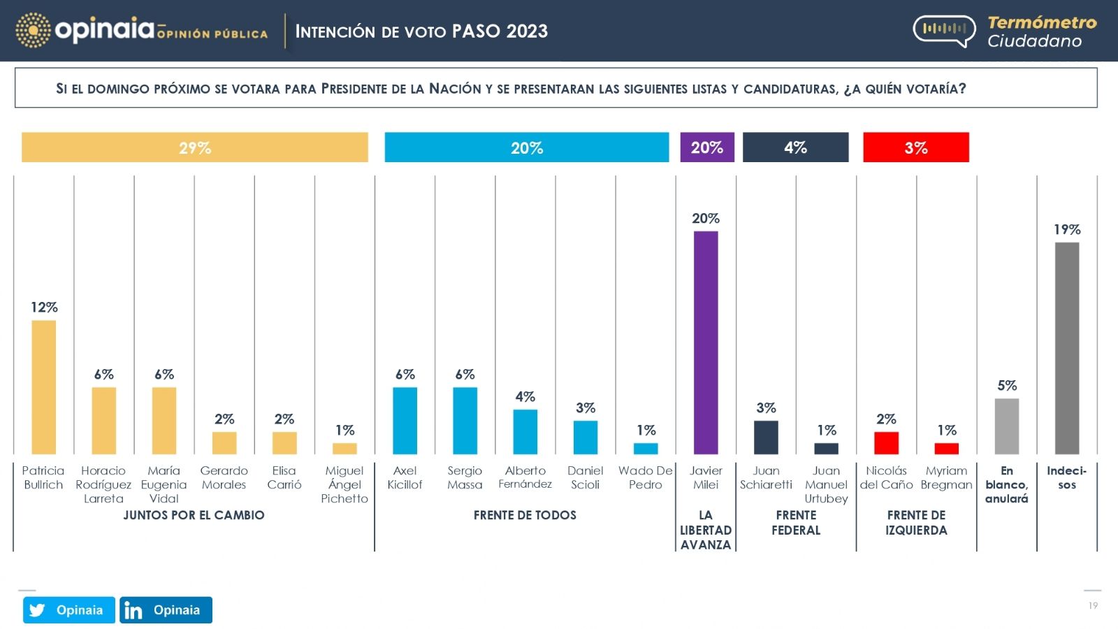 Dentro de ese marco análisis, Opinaia pregunta lo siguiente: "Si el domingo se votara para Presidente de la nación y se presentaran las siguientes listas y candidaturas, ¿a quién votaría?".