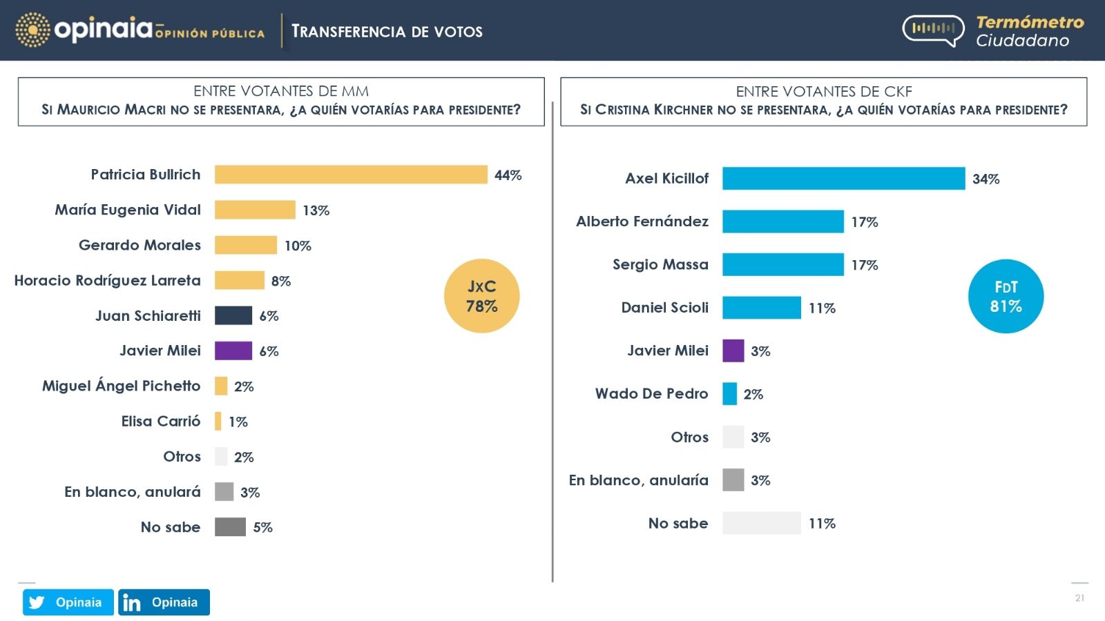 - El 44% de los votos del expresidente Mauricio Macri irían a la presidenta del PRO, Patricia Bullrich. El 34% de los votos de la vicepresidenta Cristina Fernández de Kirchner pasarían en valor del gobernador bonaerense, Axel Kicillof.