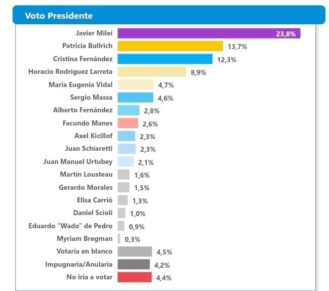 Con estos números, Juntos por el Cambio se impone por casi diez puntos ante el Frente de Todos y Milei, quienes quedan técnicamente empatados, con una leve ventaja a favor del economista liberal que dejaría en tercer lugar al oficialismo.