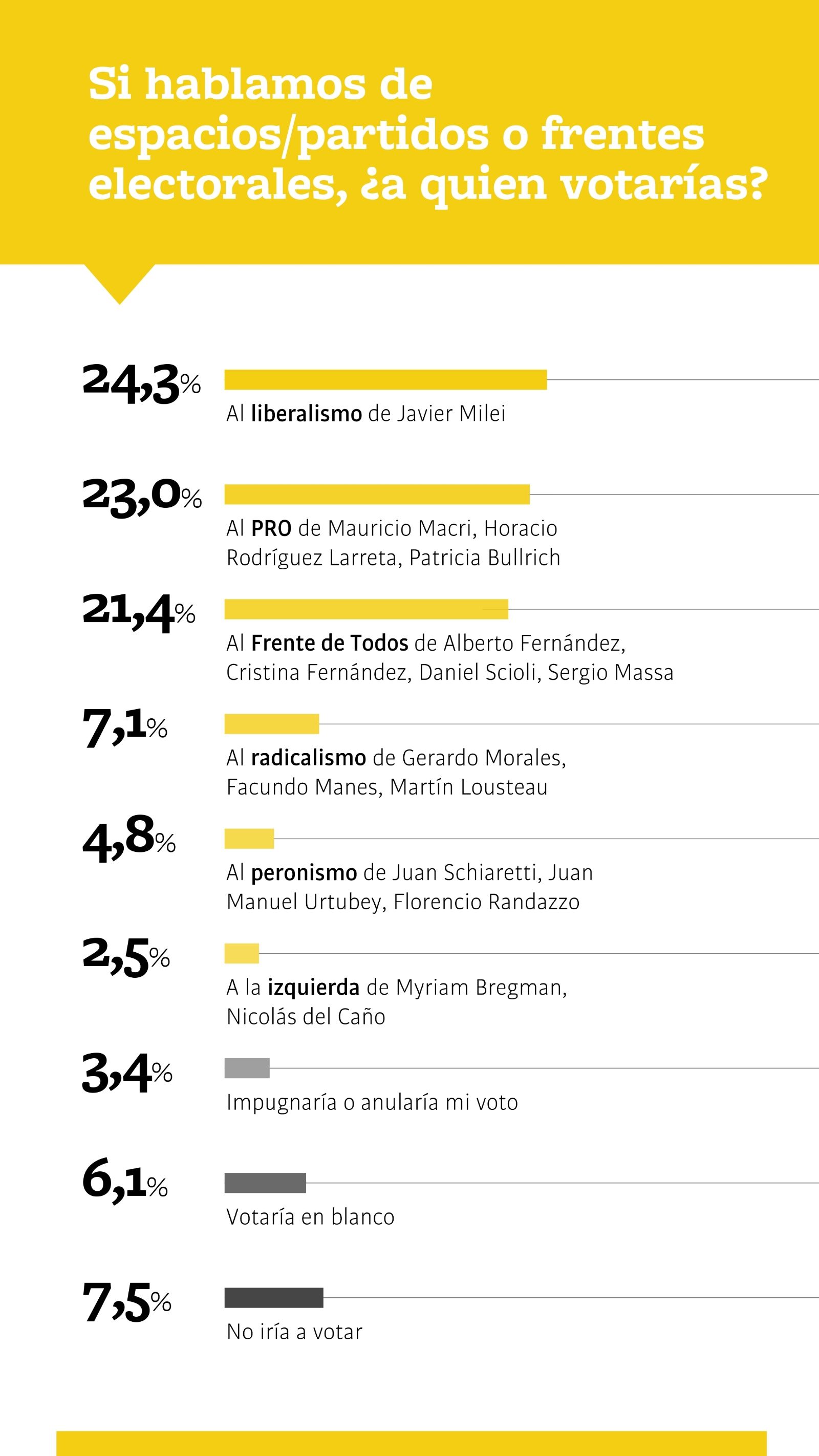 Respecto a la intención se voto, los investigadores midieron la cuestión bajo la siguiente consigna: "Si hablamos de espacios/partidos o frentes, ¿a quién votarías?". El liberalismo de Javier Milei se encuentra primero con un 24,3% y le sigue el PRO de Bullrich, Macri y Larreta con un 23%. El Frente de Todos descansa tercero con un 21,4%. El radicalismo de Morales, Lousteau y Manes se posiciona cuarto con un 7,1 y el peronismo de Juan Schiaretti y Juan Manuel Urtubey quinto con un 4,8%.