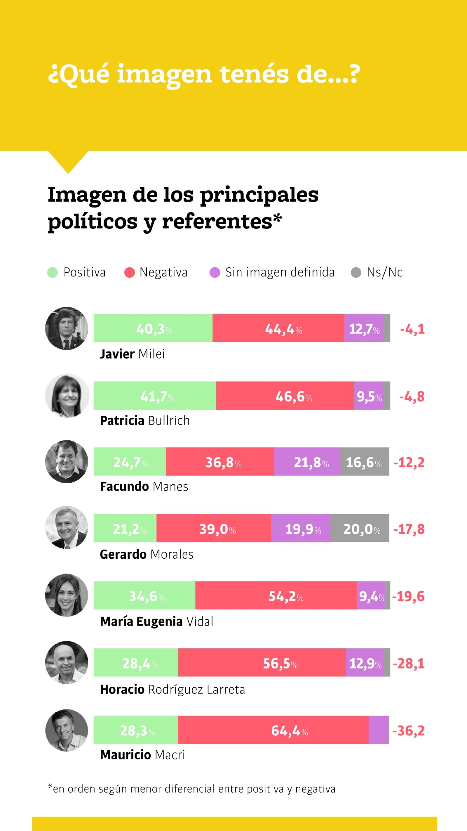 La imagen de los principales candidatos presidenciales queda de la siguiente manera. Bullrich encabeza la lista con un 41,7% de imagen positiva y un 46,6% de imagen negativa. El diputado de La Libertad Avanza, Javier Milei, aparece segundo con un 40,3% de positividad y un 44,4% de negatividad. La tercera en cuestión es la exgobernadora de la provincia de Buenos Aires, María Eugenia Vidal, con un 34,6% de percepción positiva y un 4,2% de percepción negativa.