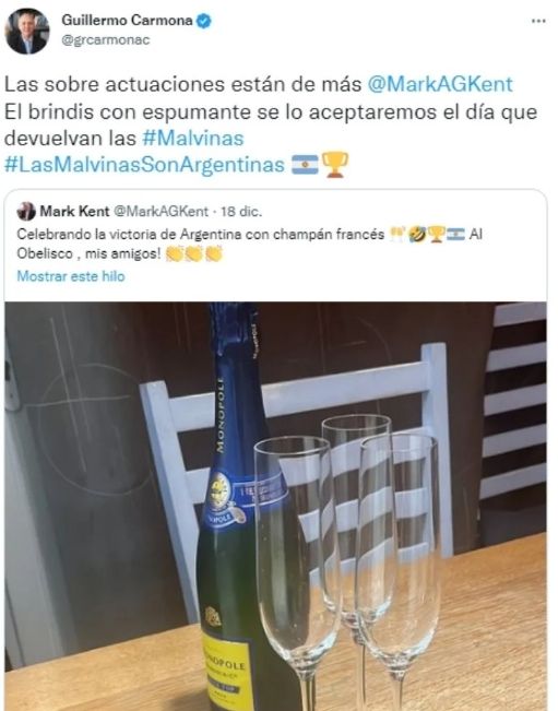 El 18 de diciembre de 2022, cuando la Selección argentina de fútbol alzó la copa en el Mundial de Qatar, Kent celebró la victoria y subió una foto bebiendo champán francés. Acto seguido, Carmona aseveró: "Las sobreactuaciones están de más. El brindis con espumante se lo aceptaremos el día que devuelvan las Malvinas. Las Malvinas son argentinas".