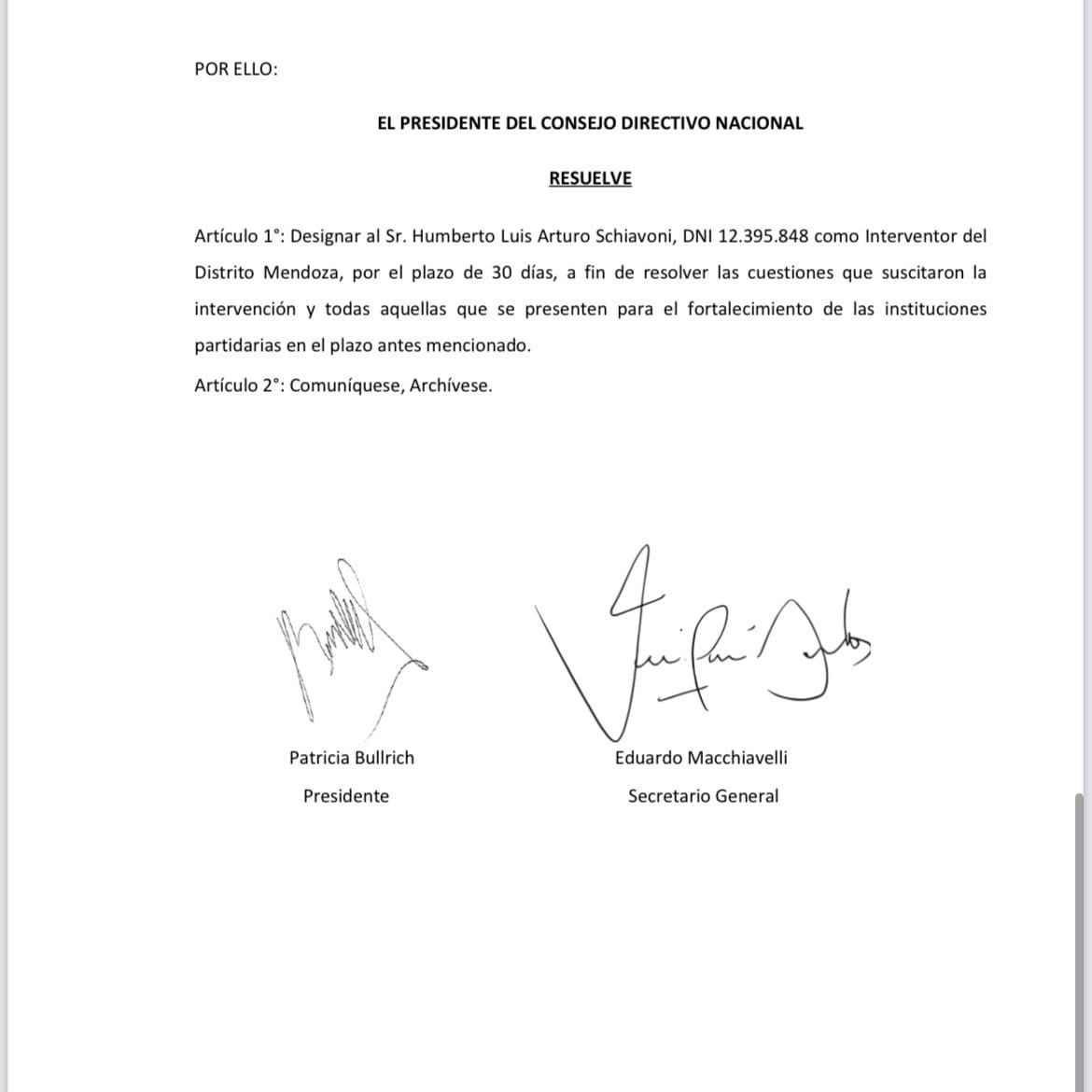El senador nacional del PRO por Misiones, Humberto Schiavoni fue designado como Interventor del Distrito Mendoza, por el plazo de 30 días, "a fin de resolver las cuestiones que suscitaron la intervención y todas aquellas que se presenten para el fortalecimiento de las instituciones partidarias en el plazo antes mencionado".