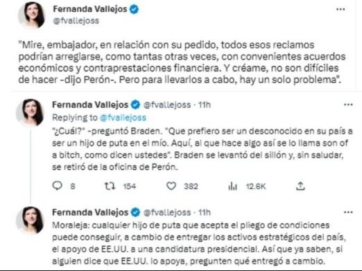 "Mire, coronel, mi gobierno sabe reconocer a sus amigos, aun a los recién llegados, ud. me entiende. Con esos gestos de amistad de parte de su gestión, mi país no pondría obstáculos para una eventual candidatura presidencial. Ud bien sabe que podría ser el candidato a presidente", escribió Vallejos citando en su hilo de Twitter a Braden, agregando que Perón contestó: "Mire, embajador, en relación con su pedido, todos esos reclamos podrían arreglarse, como tantas otras veces, con convenientes acuerdos económicos y contraprestaciones financiera. Y créame, no son difíciles de hacer -dijo Perón-. Pero para llevarlos a cabo, hay un solo problema".