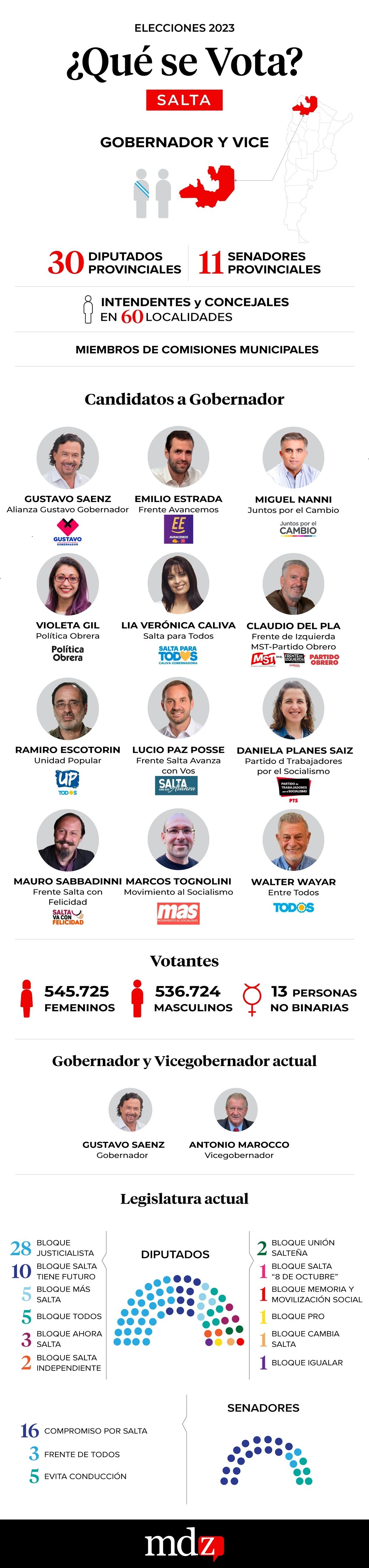 La provincia de Salta vota este domingo 14 de mayo. El gobernador peronista Gustavo Sáenz busca la reelección junto a Antonio Marocco como candidato a vicegobernador. Se enfilan bajo la alianza "Gustavo Gobernador" que incluye los frentes Unidos por Salta, Vamos Salta y País. Por el Frente Avancemos se postula el diputado del Frente de Todos Emiliano Estrada y por Juntos por el Cambio, el legislador radical Miguel Nanni.